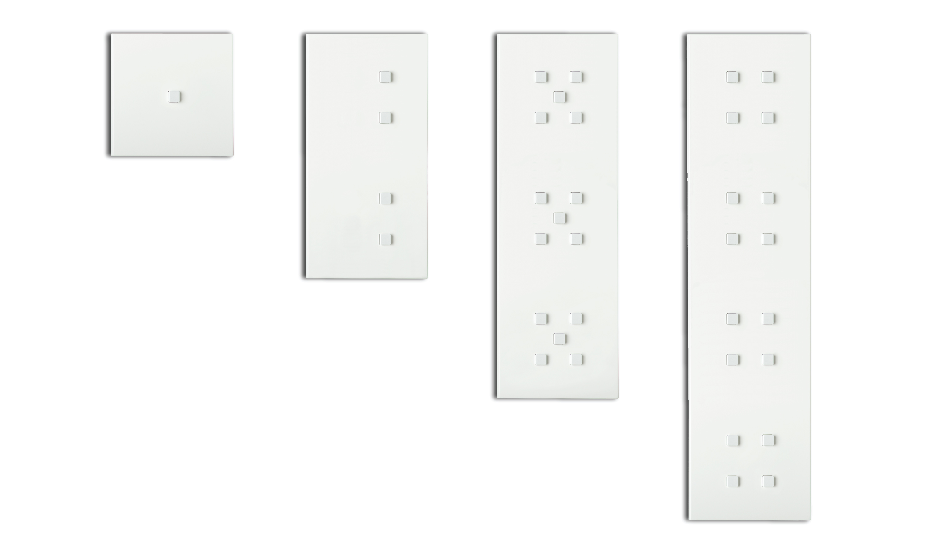 5 sizes of panel: simple 85 x 85 mm, double 85 x 156 mm, triple 85 x 227 mm, quad 85 x 298 mm, quintuple 85x369 mm. For vertical or horizontal use.